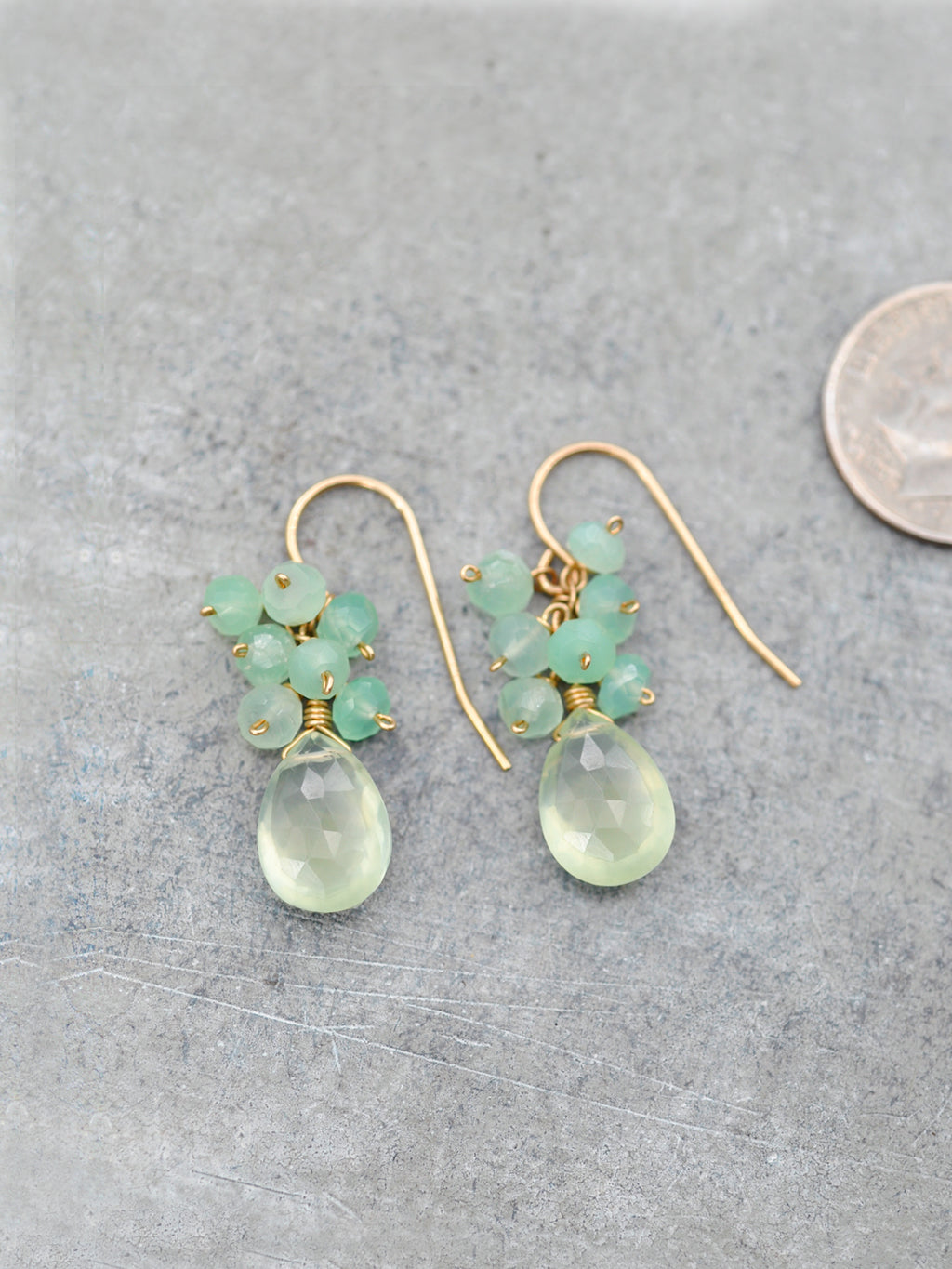 Glowing Prehnite teardrops are topped with a cluster of milky Peruvian Calcite gems. Available in 14K Goldfill or Sterling Silver. Earrings hang approx. 3/4"-1" long. (Shown next to a dime for scale).